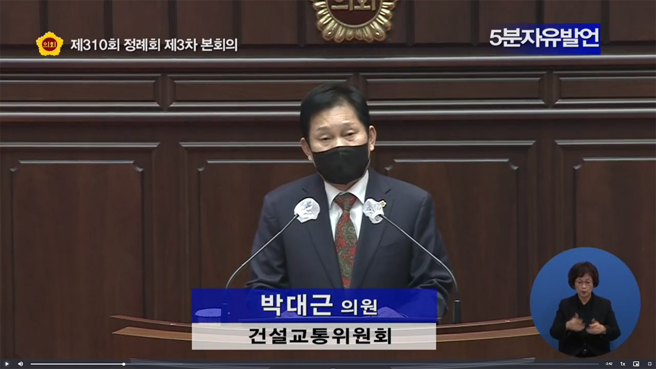 존경하는 안성민 의장님 그리고 선배·동료의원 여러분! 박형준 시장님과 하윤수 교육감님을 비롯한 관계공무원 여러분! 반갑습니다, 북구 출신 건설교통위원회 박대근 의원입니다.