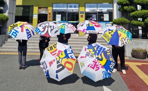 부산 북구는 31일 폐현수막 600여 장을 재활용하여 우산 516개, 파라솔 30개를 제작했다고 밝혔다.