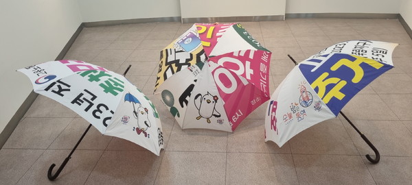 '폐현수막 새활용 우산'은 지난해 행정안전부 폐현수막 재활용 공모사업에 선정돼 일회성으로 소모되는 폐현수막 처리방안의 일환으로 우산을 제작, 무료 대여서비스를 실시했는데 시민들의 큰 호응으로 올해는 파라솔도 함께 제작하게 됐다.