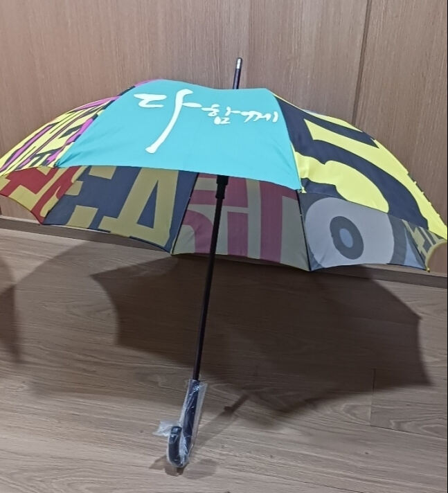 폐비닐, 폐현수막 등으로 만든 우산에는 ‘다함께’라는 문구가 새겨졌다.